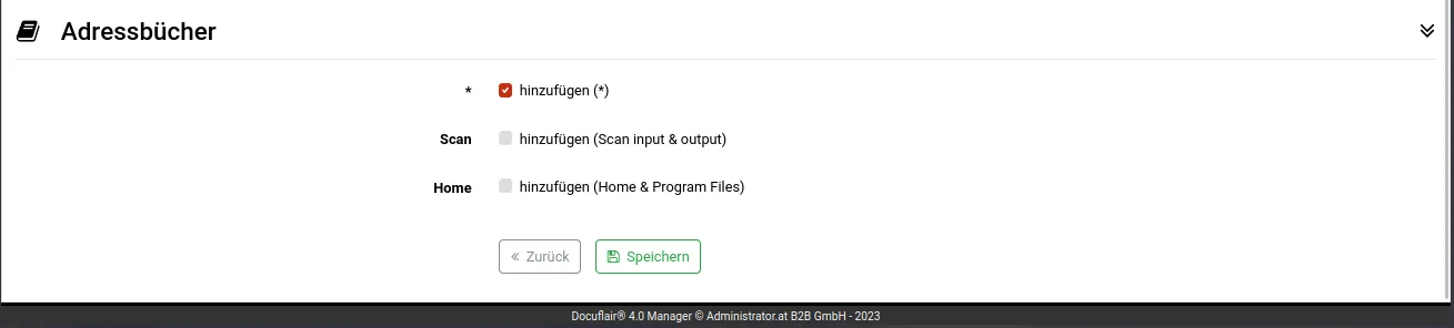 Legt fest, in welchen Adressbüchern ein Kontakt sichtbar ist. Im Zuge einer Installation wird ein Standard-Adressbuch mit dem Namen "*" erstellt. Weitere Adressbücher können in beliebiger Anzahl erstellt werden.