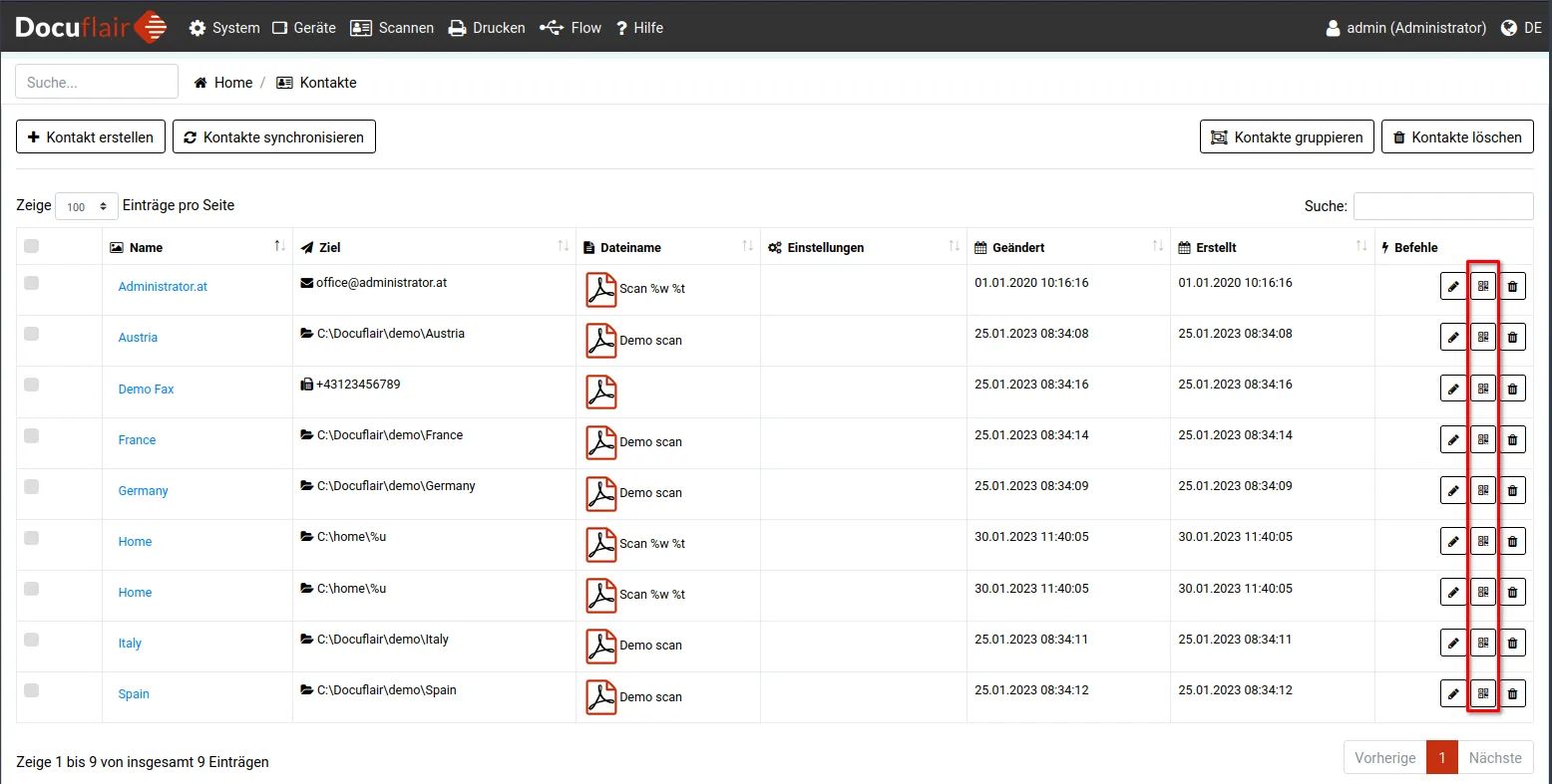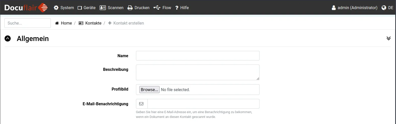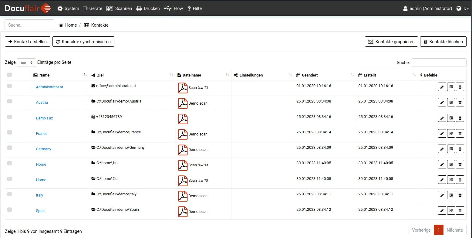 Kontakte in Docuflair sind Scan-Ziele — also Orte, an die gescannte Dokumente geschickt werden sollen. Ein Kontakt kann eine E-Mail-Adresse, ein Ordner im Netzwerk oder eine Fax-Nummer sein. Am Drucker wählen Sie einfach den gewünschten Kontakt aus, scannen Ihr Dokument, und Docuflair kümmert sich um die Zustellung.