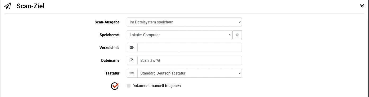 Abhängig vom gewählten Kontakttyp stehen unterschiedliche Optionen zur Verfügung. Zum Bespiel legt Speicherort einen lokalen oder entfernten Ordner zum Abspeichern der Dokumente fest, Verzeichnis gibt ein Unterverzeichnis an. Der Dateiname spezifiziert, wie die Benennung des gescannten Dokumentes standardmäßig erfolgen soll. Diese Vorgabe kann am Multifunktionsdrucker überschrieben werden. Zur automatischen Dateinamen-Generierung werden verschiedene Platzhalter unterstützt: