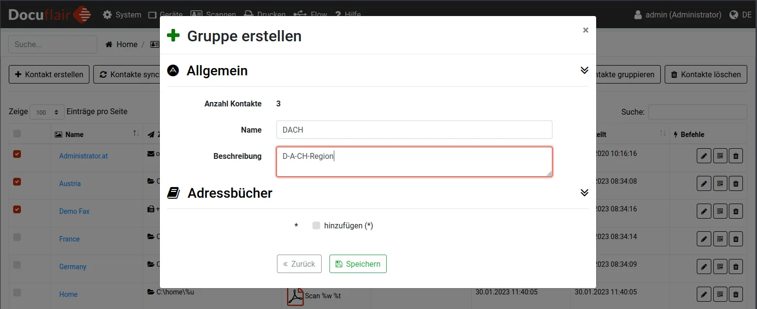 Eine neue Gruppe kann erstellt werden, indem im Menü auf Scannen/Kontakte geklickt wird. In der dann dargestellten Ansicht mit der Liste aller Kontakte müssen in der Spalte Auswählen alle Kontakte markiert werden, die Mitglied der neuen Gruppe sein sollen. Um die Gruppe zu erstellen, muss auf Kontakte gruppieren geklickt werden.