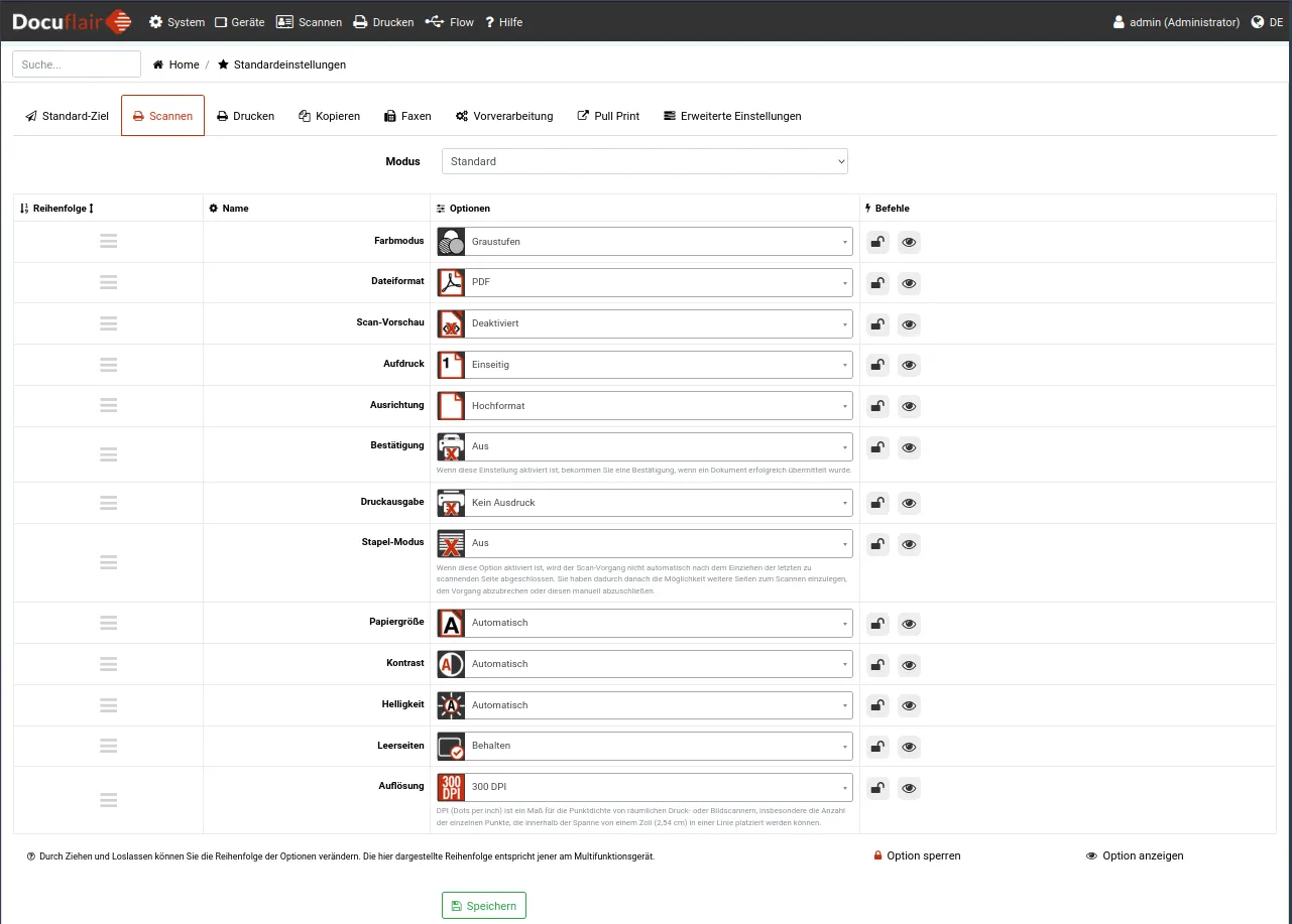Mit Option sperren kann in der Liste der Scan-Einstellungen für jeden Eintrag festgelegt werden, ob eine Einstellung vom Anwender am Multifunktionsdrucker geändert werden darf. Optionen anzeigen legt fest, ob einzelne Scan-Einstellungen für Anwender am Multifunktionsdrucker sichtbar sind oder versteckt werden. Die einzelnen Elemente können mittels Drag&Drop verschoben werden, indem auf die Zahl mit der Reihenfolge geklickt wird.