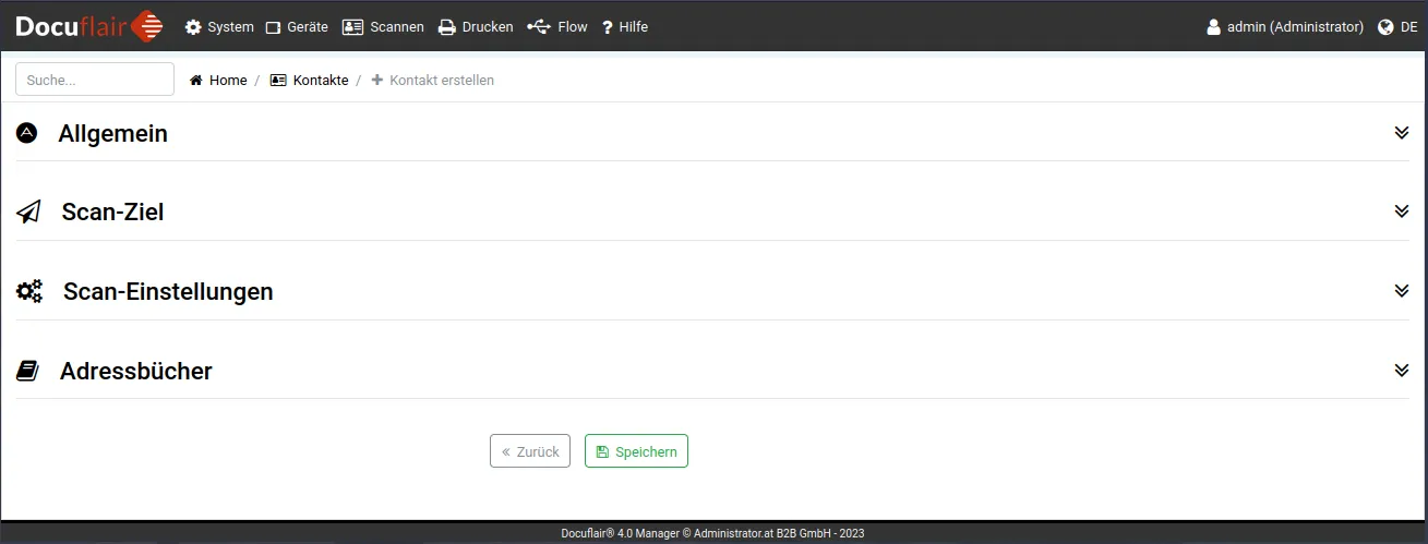 Ein neuer Kontakt kann erstellt werden, indem im Menü auf Scannen/Kontakte geklickt wird. In der dann dargestellten Ansicht mit der Liste aller Kontakte muss auf Kontakt erstellen geklickt werden.