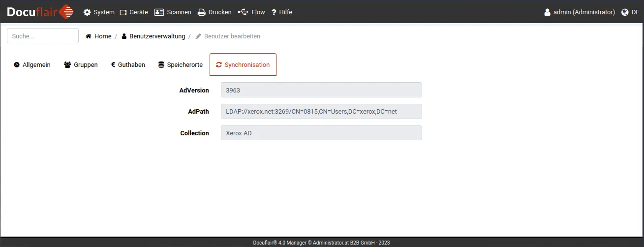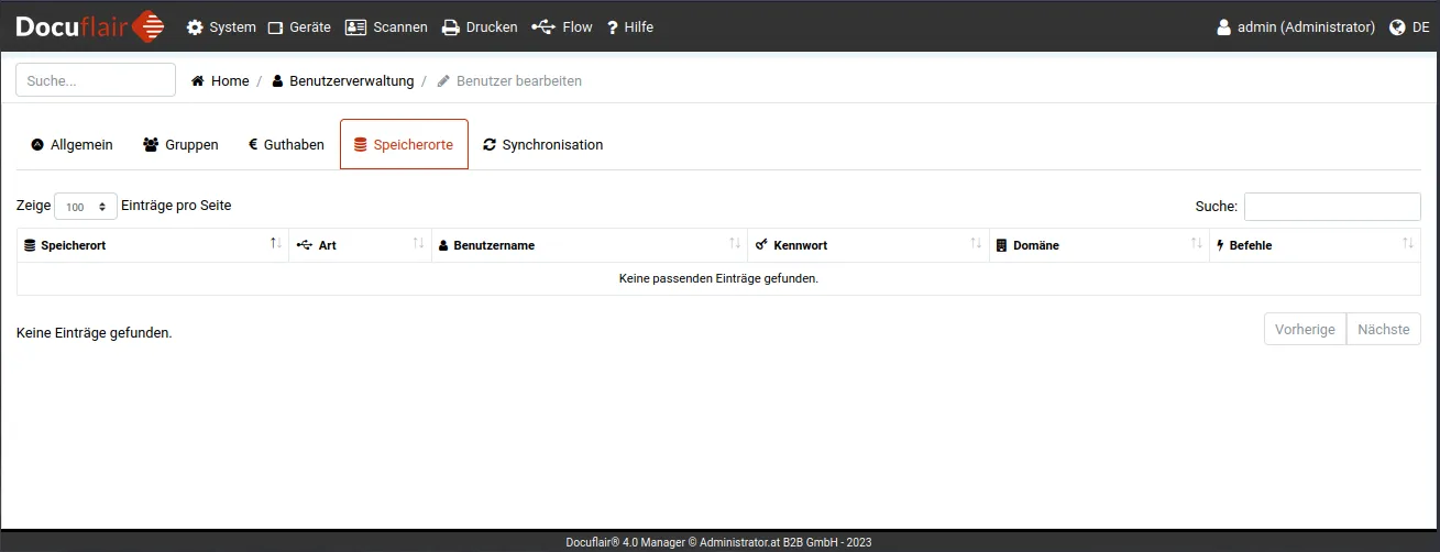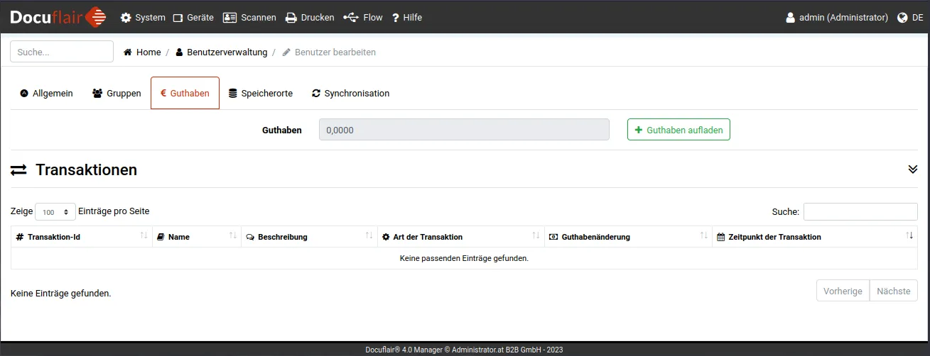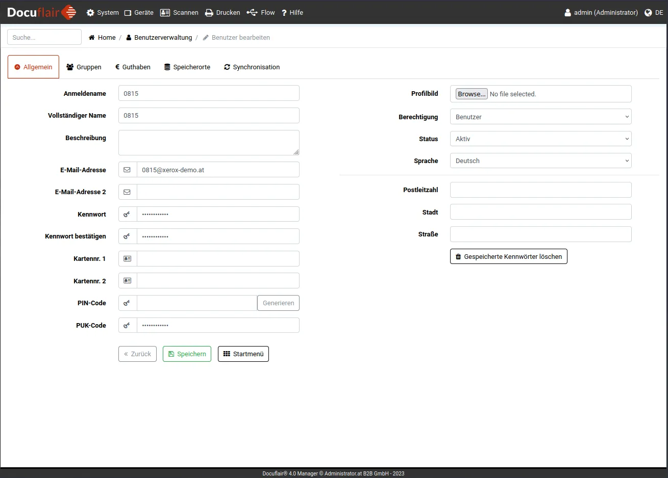 Erstellen Sie in System > Benutzerverwaltung einen neuen Benutzer oder bearbeiten Sie einen, so gelangen Sie zu den folgenden fünf Unter-Menüs. + Allgemein + Gruppen + Guthaben + Speicherorte + Synchronisation