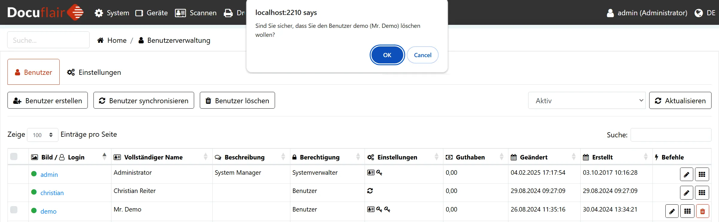 Um das unabsichtliche Löschen von Benutzern zu vermeiden wird vor Durchführung in einem Popup immer eine zusätzliche Sicherheitsabfrage gefordert.