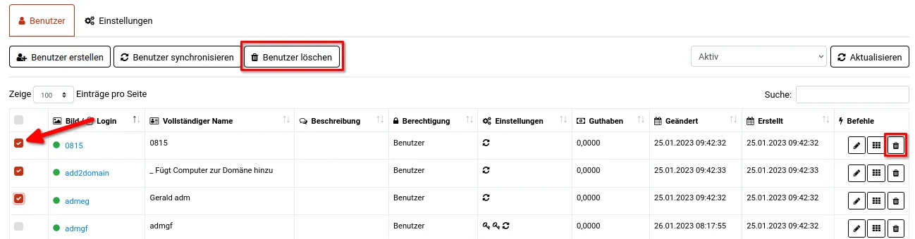 Auf der linken Seite einer Benutzerzeile befindet sich eine Auswahlbox, die eine Löschung mehrerer ausgewählter Benutzer auf einmal ermöglicht. Hierfür werden die gewünschten Benutzer zuerst ausgewählt und dann mit Klick auf den Button Benutzer löschen, entfernt. Bestimmte Benutzer können nicht entfernt werden. Dazu zählen der Standardbenutzer admin und aus Verzeichnisdiensten (LDAP / Active Directory / Datenbank-Import) synchronisierte Benutzer. Letztere sind erkennbar durch zwei Pfeile die gemeinsam einen Kreis bilden.