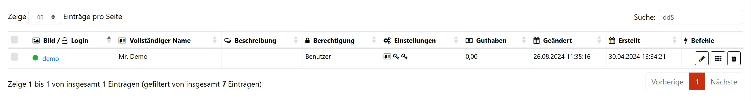 Das einzelne Löschen von Benutzern kann über den Mülleimer auf der rechten Seite der Benutzerzeile durchgeführt werden.