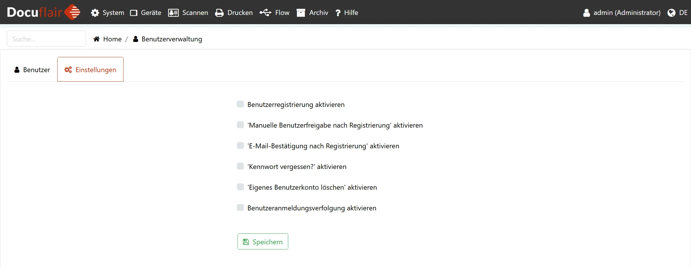 | Benutzerregistrierung aktivieren | Ermöglicht es neuen Benutzern, sich selbständig über die Anmeldeseite zu registrieren. Wenn deaktiviert, können nur Administratoren neue Benutzerkonten anlegen. |