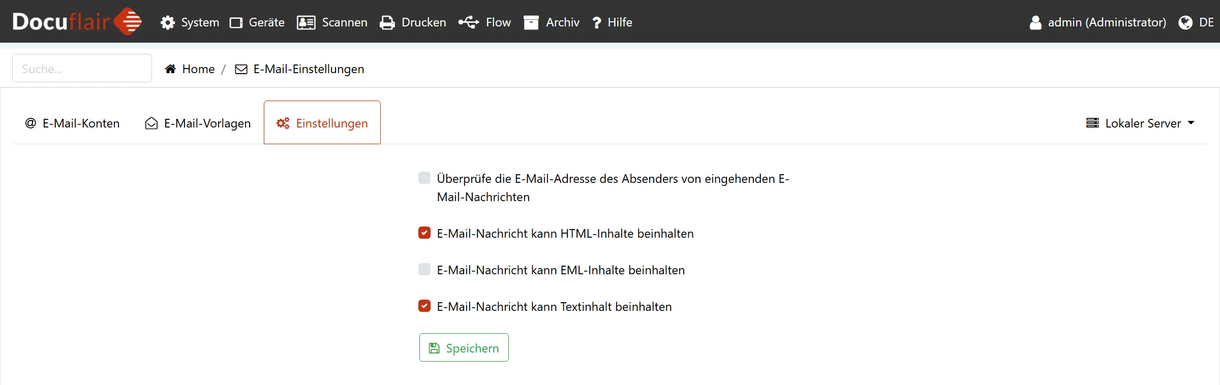 Die E-Mail-Einstellungen legen fest, wie Docuflair E-Mails versendet — z.B. welche Nachrichtentexte verwendet werden, wie Anhänge formatiert werden und welche allgemeinen Optionen für alle E-Mail-Konten gelten.