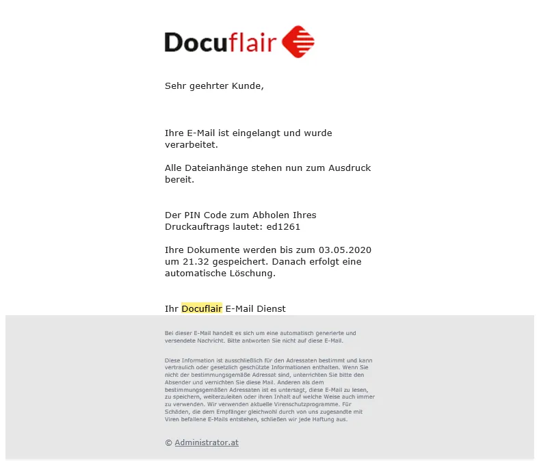 Darstellung und Texte können beliebig editiert werden, indem innerhalb vom Docuflair Installationsverzeichnis x:\Docuflair\Instances auf das Verzeichnis der zu ändernden Instanz und dann auf .\data\Email gewechselt wird.