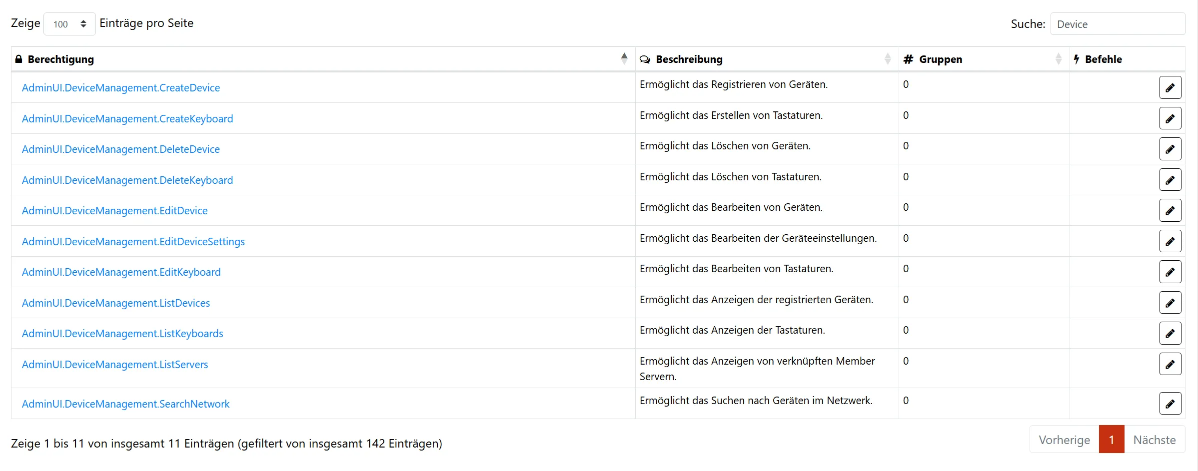 Unter Berechtigungen werden alle verfügbaren aufgelistet und welche Gruppen zugeordnet sind.