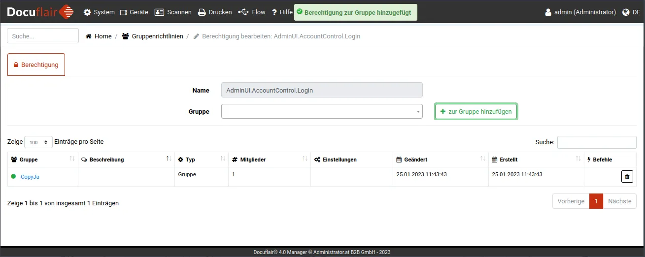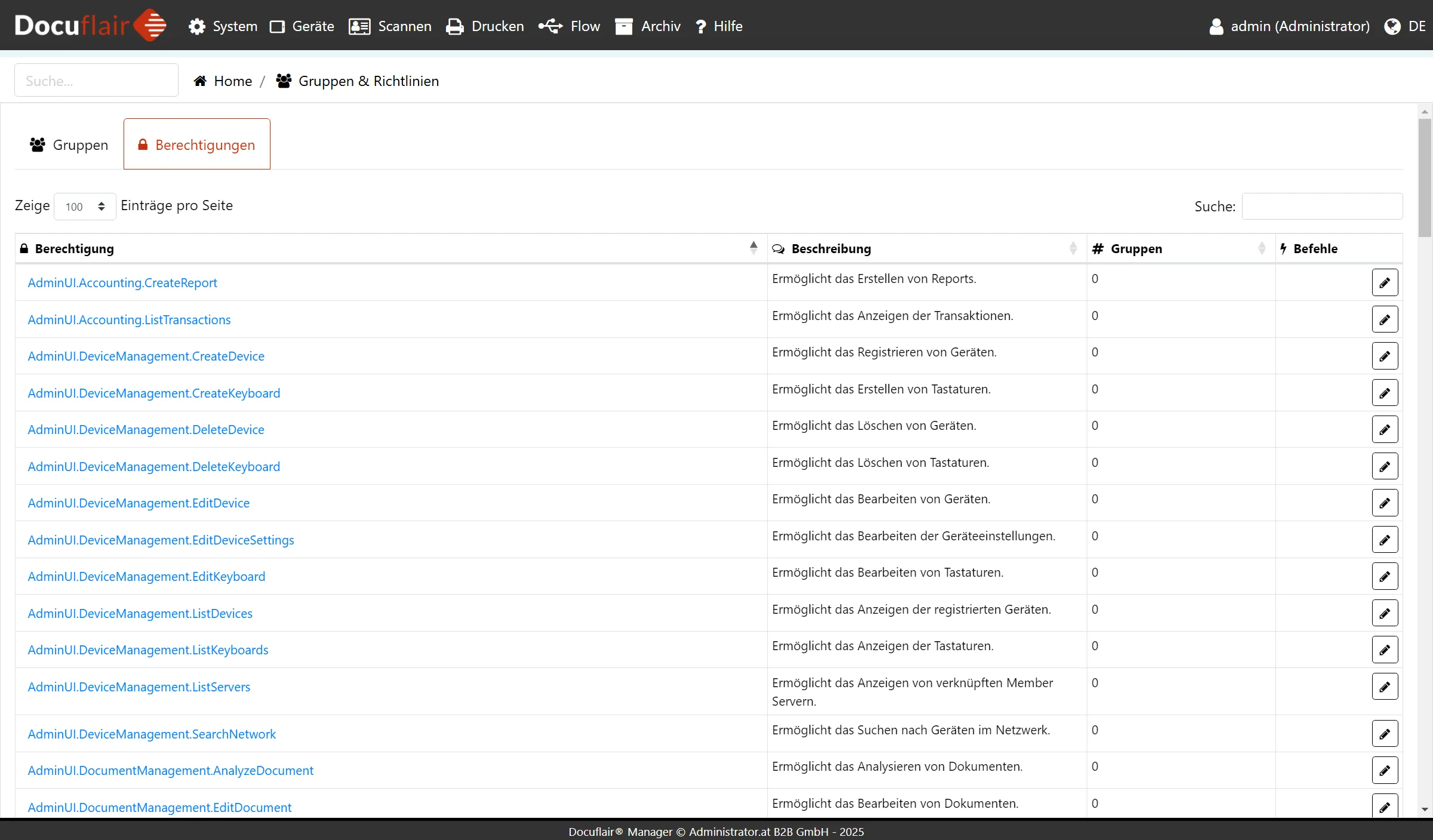 Berechtigungen legen fest, was eine Gruppe von Benutzern in Docuflair tun darf — z.B. ob sie drucken, scannen oder Einstellungen ändern dürfen. Durch die Zuweisung von Berechtigungen an Gruppen steuern Sie, welche Funktionen welchen Mitarbeitern zur Verfügung stehen.